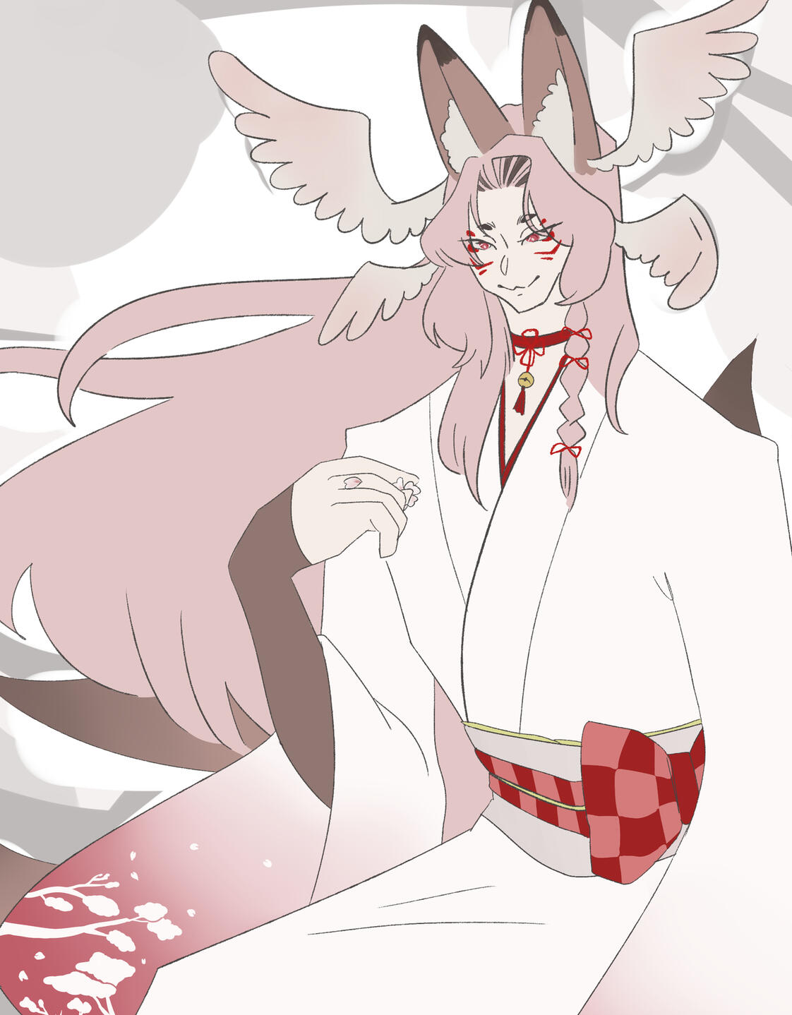 Though it is quite common for kitsune to change their shape according to their company, Sakura mostly maintains the image of a young man with long, strawberry blonde hair, dark brown roots peeking out under his bangs. The markings on his face, made from a mixture of flowers and cherries, match the color of his eyes. Likewise, his garments stay in the realm of reds, patterns of cherry trees and petals decorating the furisode length sleeves.He has tall ears and six fox tails, each for a hundred years. His fur is a desaturated tan color, ending with a dark gradient on the tips. Two pairs of wings accompany his ears, quite useless for anything other than differentiating him from messenger foxes.